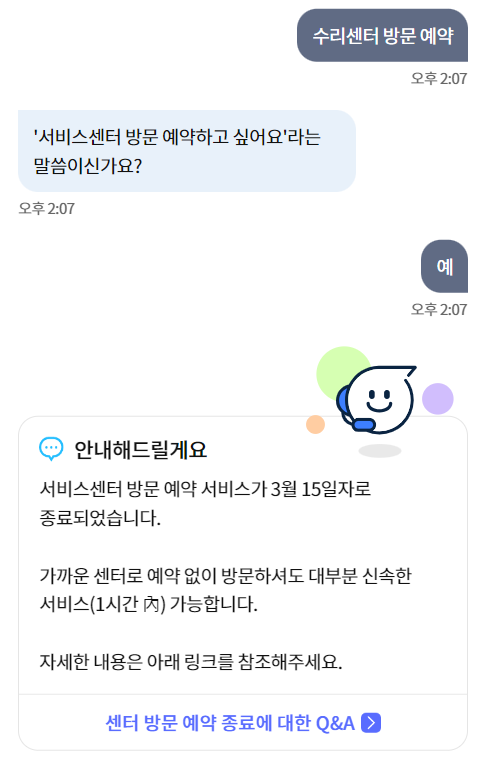 삼성전자 서비스 센터 방문 예약 서비스는 24년 3월에 종료 되었다고 합니다.