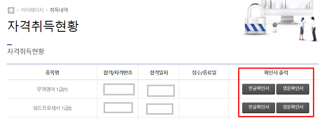 *무역영어 증명서 온라인 발급은 마이페이지-> 취득내역-> 확인서 출력에서 하실 수 있습니다.
